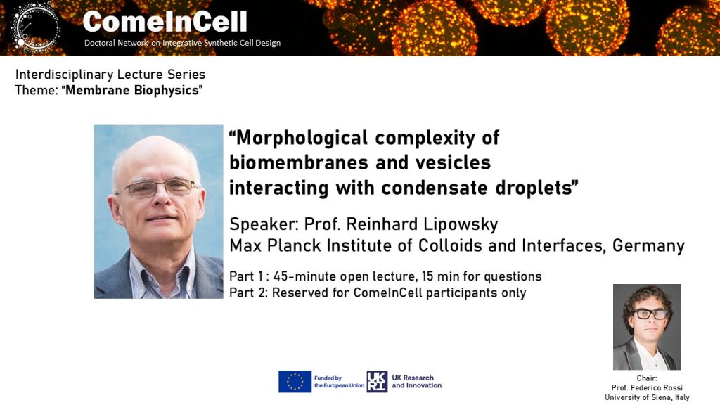 On 16.02.2026, we host the lecture “Morphological complexity of biomembranes and vesicles interacting with condensate droplets” as part of our Interdisciplinary Lecture Series (ILS). The lecture is presented by Prof. Reinhard Lipowsky (Lipowsky’s website).